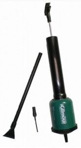 Poudreuse manuelle de 38cm de long comprenant unréservoir de 400g et une rallonge de 38cm.